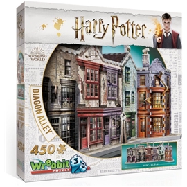 Hauska Harry Potter 3D-palapeli Wrebbitiltä, Diagon Alleyltä. Palapelissä on 450 palaa, jotka on valmistettu ohuesta kartongista, takapuolellaan vaahtokumia ja ne ovat 6 mm paksuja.