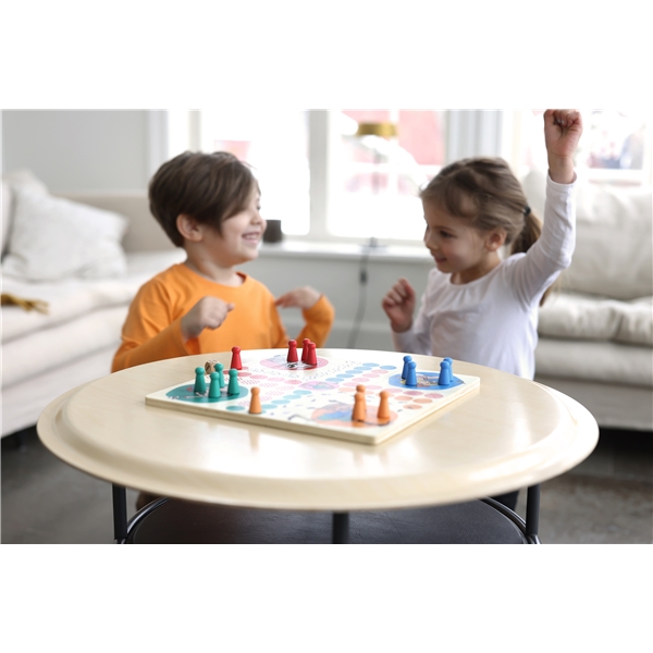 Fiaspeli on puinen ja sisältää 1 pelilaudan, 16 pelinappulaa neljässä eri värissä, 1 nopan ja pelisäännöt. Hauska peli lapsille, joka tarjoaa leikkisää hauskuutta koko perheelle! Pelisäännöt löydät pakkauksesta.