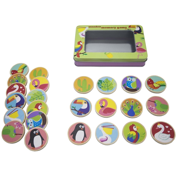 Hauska puinen muistipeli, jossa on hienot värit ja suloisia eläimiä ja kasveja. Palat ovat pyöreitä ja valmistettu puusta. Peli on pakattuna purkkiin ja se on helppo ottaa mukaan matkalle.