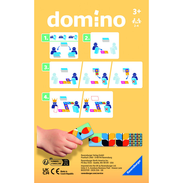 Pelaajat vuorottelevat asettamalla dominopalikoitaan. Palikka on asetettava siten, että toisen pään kuva sopii yhteen jo siellä olevan palikan kuvan kanssa. Palikoita saa asettaa vain jompaankumpaan päähän. Se, joka ensimmäisenä pääsee eroon kaikista palikoistaan, voittaa pelin!