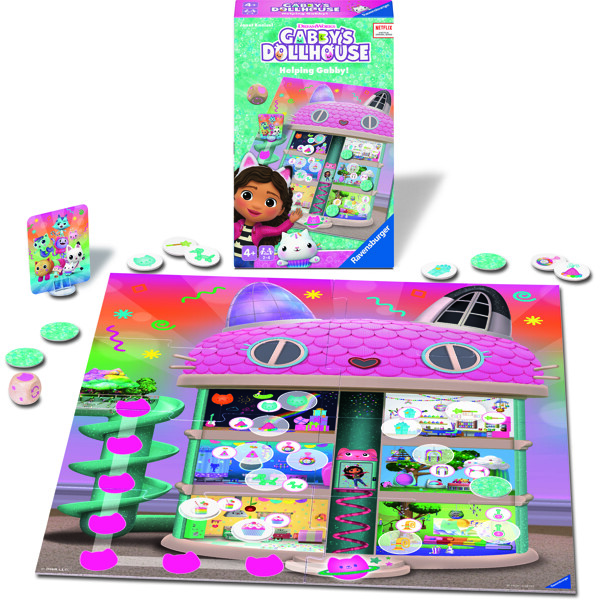 Sisältää: 1 pelilauta (8 osaa), 1 Gabby-kissa-pelinappula, 13 pyöreää laattaa, 1 noppa ja ohjeet.