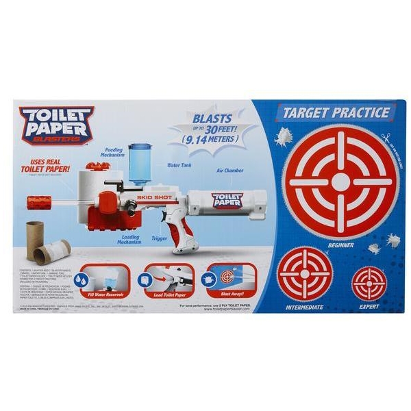 "Niin siistiä! Toilet Paper Blasters™ muuntaa taianomaisesti normaalin vessapaperin puhtaiksi, hygienisiksi sylkikuuliksi! Ota rulla vessapaperia ja ammu! Toilet Paper Blasters™ tarvitsee vettä eikä sylkeä muuntaakseen vessapaperin sylkikuuliksi joita voidaan ampua jopa 9 metrin päähän! Sylkikuulat on helppo pestä pois, ne ovat biologisesti hajoavia eivätkä ne jätä jälkiä! • Ampuu vessapaperia jopa yli 9 metrin päähän! Et tarvitse paristoja! • Muuttaa vessapaperin puhtaiksi sylkikuuliksi! (veden, EI syljen avulla) • Helppo puhdistus, biologisesti hajoavat eikä jätä jälkiä! • Tarvitset vain normaalia vessapaperia! 1 rulla = 350+ sylkikuulaa! (vessapaperi ei sisälly) • Sisältää 1 Toilet Paper Blaster, 3 maalitaulua kannessa
