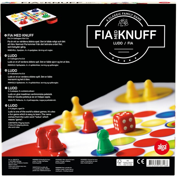 Kaikki pitävät Fiasta! - Peliklassikoiden suosikki! Neljä samanväristä nappulaa tulee kiertää pelilauta ja sitten kerääntyä laudan keskelle. Pelin kulkiessa jahtaavat kaikki pelaajat toistensa nappuloita. Peliaika n. 20 min. Sisältää pelilaudan, 4x4 pelinappulaa, nopan ja sääntökirjan.