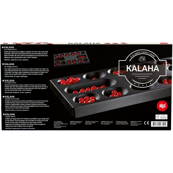 Kalaha on peli, jolla on ikivanhat juuret! Tässä haastavassa pelissä yritetään siirtää 72 kuulaa pelilautaa pitkin, niin että niin monta kuin mahdollista päätyy pelaajan omaan koloon. Pelin voittamiseen vaaditaan taktiikan taitamista! Kalahaa on pelattu satoja, ellei jopa tuhansia vuosia monissa eri maailmankolkissa. Sen takia Kalaha on jopa yhtä jännittävä, haastava ja klassinen kuin shakki!