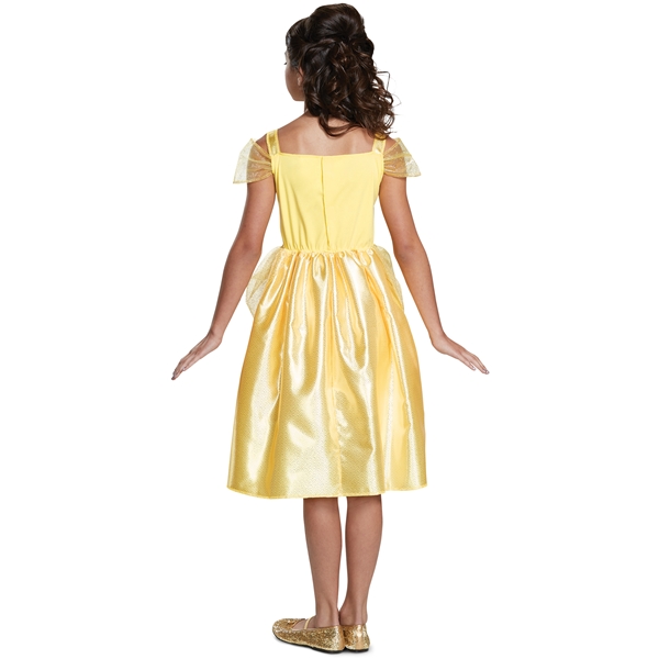 Anna lapsesi pukeutua älykkääksi, rohkeaksi ja kauniiksi Belleksi! Tässä puvussa on kuvioitu liii, rypytetyt hihat kimaltein ja hame, jossa on rypytetty kultainen vyö.