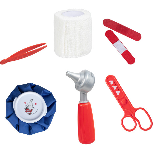 Tämä hieno ensiapulaukku sisältää tarvikkeita pienten vaivojen hoitoon. Muumi-mamma tietää, että laastarin lisäksi tarvitaan myös lämmin halaus parantumiseen.