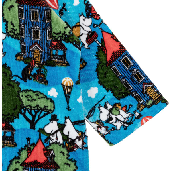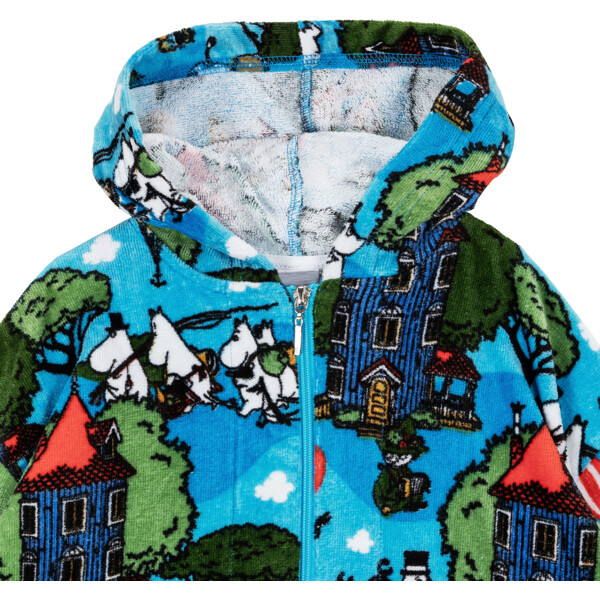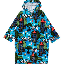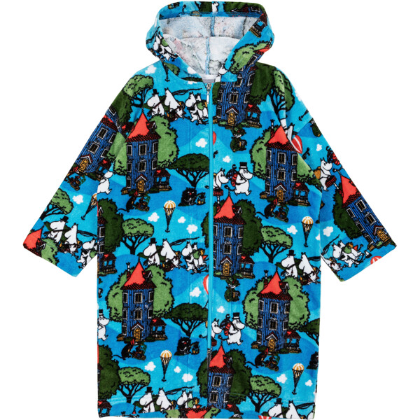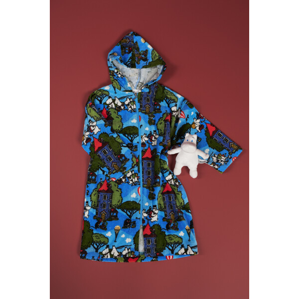 Pehmeä ja mukava Muumi kylpytakki lapsille. Kylpytakissa on huppu, ripustuslenkki niskassa ja vetoketju edessä. Materiaali on pehmeää puuvillaveluuria, jossa on sisäpuolella frotee, jolla on korkea imukyky.