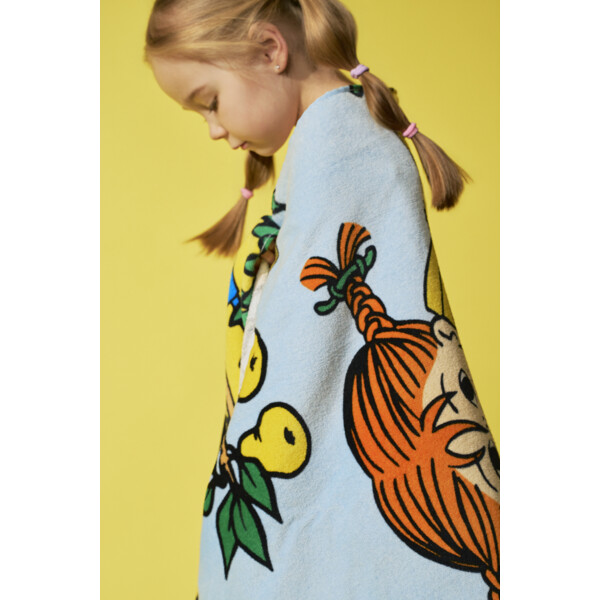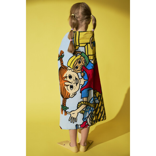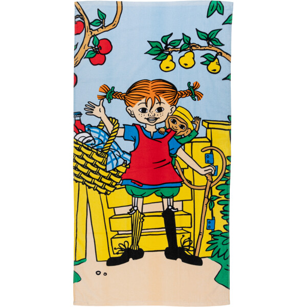 Pippi Pitkätossu Piknik Kylpypyyhe on värikäs kylpypyyhe, jossa Pippi ja Herra Nilsson ovat menossa piknikille. Kylpypyyhe on pehmeää puuvillaveluuria ja sen sisäpuoli on froteeta, jolla on korkea imukyky.