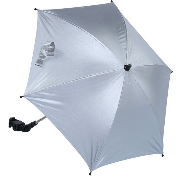 Aurinkovarjo polyesteria, UV-suojalla (50+) ja säädettävällä varrella, josta sen saa kiinni vaunuihin. Halkaisija 75 cm.