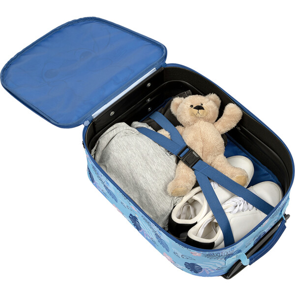 Disney Stitch lasten matkalaukku, jossa on suuri päälokero ja kaksisuuntainen vetoketju koristeellisella vetokahvalla. Varustettu sisäpuolisilla joustavilla hihnoilla, säädettävällä ja lukittavalla teleskooppikahvalla, kantokahvalla, kahdella pyörällä ja kahdella tukijalalla. Siinä on myös nimikenttä. Täydellinen matkustamiseen ja kouluun!Materiaali: Polyesteri.