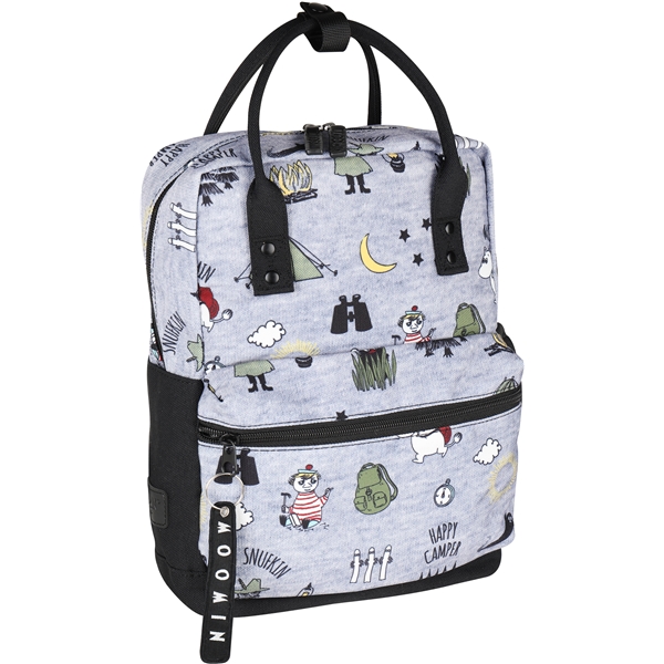 Muumi Viuhti Reppu Retki Harmaa on hieno reppu vaalealla harmaalla pohjalla ja retkiaiheella. Siinä on teltta, lyhtyjä, leiritulia, reppuja ja Muumipeikko, Nuuskamuikkunen, Tuutikki ja hattivatit. Reppu on valmistettu vettähylkivästä polyestericanvaksesta ja siinä on säädettävät, topatut olkahihnat ja kantokahva. Repun selkäosa on kevyesti topattu ja pohja on muotoonommeltu. Siinä on tuplavetoketjut ja sisällä suuri tasku sekä pienempi tasku joustavalla reunalla selkää vasten, sopien esim. ipadille tai kannettavalle tietokoneelle. Etuosassa on vetoketjullinen ulkotasku ja vetoketjun vetimessä on irroitettava avainperäetiketti, jossa lukee Moomin.