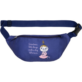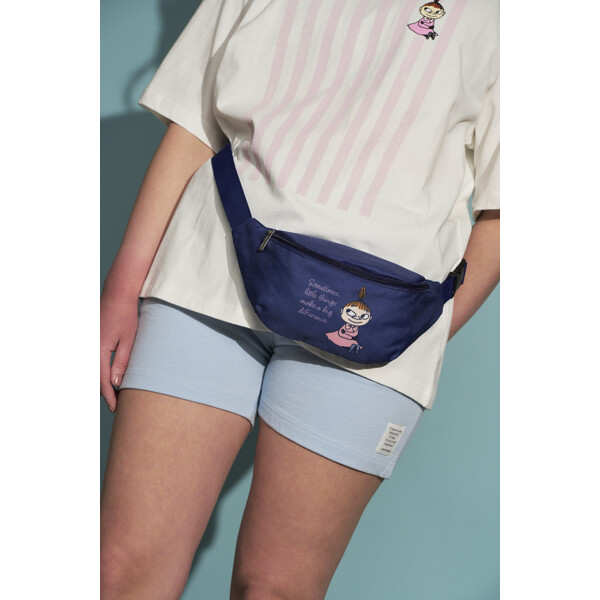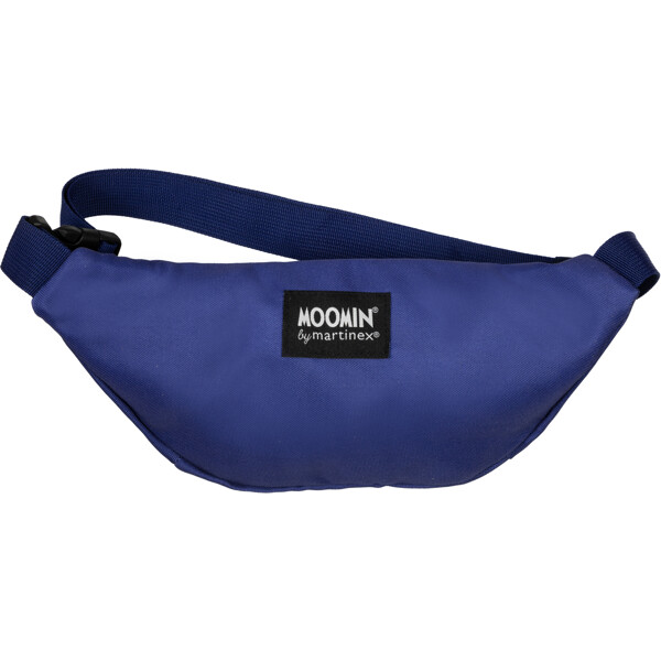Käytännöllinen Muumi vyölaukku, joka on valmistettu tukevasta polyesteristä. Laukussa on säädettävä vyötäröhihna ja vetoketju ylhäällä.