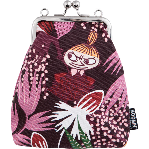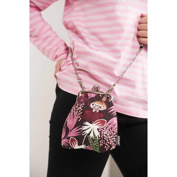 Pieni muumilaukku tukevasta puuvillakankaasta. Irrotettava olkahihna (130 cm) on osittain valmistettu metallista. Yläosassa laukussa on metallinen lukko.