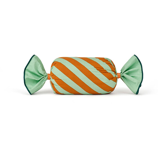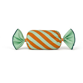 Tämä tyyny saa muotonsa juuri käärittyjen karamellien inspiroimana – pehmeä, sylinterinmuotoinen tyyny, jonka päät on kauniisti solmittu kuin kääritty karkki. Vihertävät ja karamellinväriset raidat muistuttavat kolan ja minttukarkin sekoitusta.