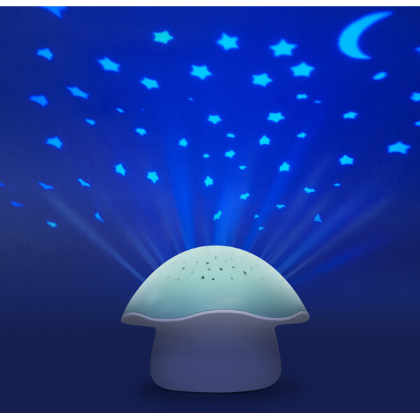 Pabobo Tähtiprojektori Sieni Musiikki on johdoton, paristokäyttöinen yövalo ja soittorasia, joka voidaan helposti sijoittaa mihin tahansa lapsen huoneessa. LED-lamppu heijastaa tähtitaivaan, joka vaihtaa väriä hitaasti, mutta on myös mahdollista asettaa kiinteä valo suosikkiväriin (sininen, vihreä tai oranssi). Yövalo voi myös soittaa rauhallista kehtolaulua (2 äänenvoimakkuutta) tai valkoista kohinaa sydämenlyöntien muodossa auttaakseen lasta nukahtamaan helpommin.Lamppu sytytetään/sammutetaan yksinkertaisella painalluksella ja se sammuu automaattisesti 22 minuutin kuluttua. Älykäs, vaihtoehtoinen itkusensori sytyttää lampun, jos lapsi herää ja itkee yöllä. Lamppu on johdoton ja toimii 3 AA-paristolla.Pabobo Tähtiprojektori Sieni Musiikki -tiedot:– Heijastaa tähtitaivaan 3 värissä.– LED-lamppu, ei kuumene.– Soittaa rauhallista musiikkia, kaksi äänenvoimakkuutta tai valkoista kohinaa (sydänäänet).– Itkusensori.Ikä: 0 kk alkaen.Materiaali: 100 % ABS-muovia.Mitat: 16 x 16 x 12 cm.Paristot: 3 AA, eivät sisälly.Takuu: 2 vuotta.