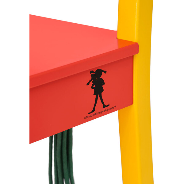 Tuolin takana on vihreä "poninhäntä" puuvillanarusta. Ja yksi jaloista on maalattu kirkkaankeltaiseksi, odottamatonta ja hieman hullua, mutta niinhän me näemme Pepin...? Käytännöllinen huonekalu, jossa on paljon persoonallisuutta, täydellinen kaikille, jotka, kuten Peppi, pitävät uusien asioiden kokeilemista arvokkaana.