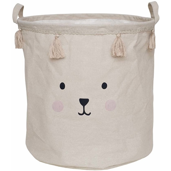 JaBaDaBaDo Säilytyskori Teddy on soma säilytyskori teddykasvoin, tupsuin ja kahdella kahvalla. Korin sisäosa on vahattu, joten se säilyttää muotonsa myös tyhjänä. Lapsen on helppo poimia siitä itse tavaroita esiin tai laittaa ne takaisin ja tämä soma säilytyskori on kiva sisustusesine makuuhuoneessa. Koria on helppo siirrellä sen kahden kahvan ansiosta ja sitä voi käyttää myös myssyjen, tumppujen tai kaulaliinojen säilyttämiseen.