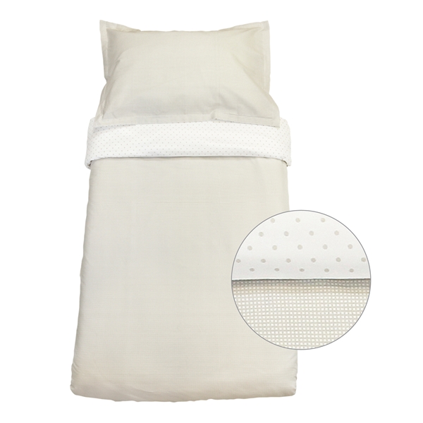 BLISS Sthlm Gingham on pussilakanapakkaus pinnasänkyyn tai vaunuun ja kehtoon. Jokainen pakkaus sisältää yhden pussilakanan ja yhden tyynyliinan. Ne ovat kaksipuolisia, joissa on kaksi eri kuviota, hieno pieniruutuinen yhdellä puolella ja pilkullinen toisella.