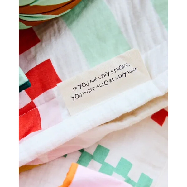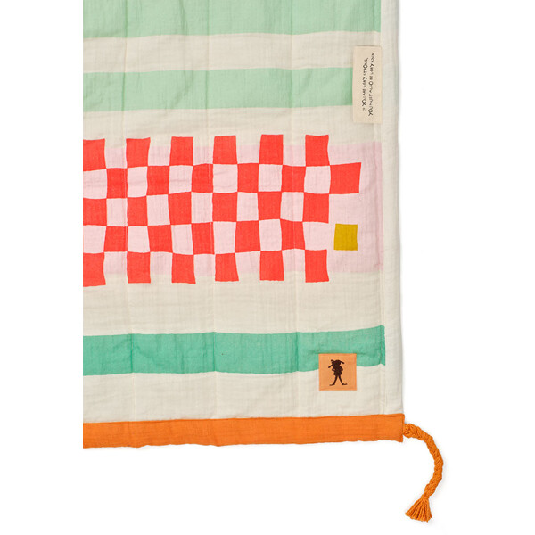 Peitto on ommeltu kerros-kerrokselta kudotusta puuvillamusliinista – kevyestä ja ilmavasta kankaasta – ohuella kierrätetystä polyesteristä valmistetulla täytteellä. Se antaa sopivasti lämpöä levossa, nukkumaan mennessä tai kun lapsi haluaa käpertyä sohvalle. Etupuolen painatus perustuu Peppi Pitkätossu -kirjojen kuvituksiin. Takapuolella on ommeltu kangasmerkki lainauksella – kuin pieni tervehdys Pepiltä itseltään. Toisessa päässä on kaksi kangaspalmikkoa ja kaksi kangaskorvaa – viittaus Peppiin ja hänen hevoseensa.