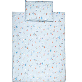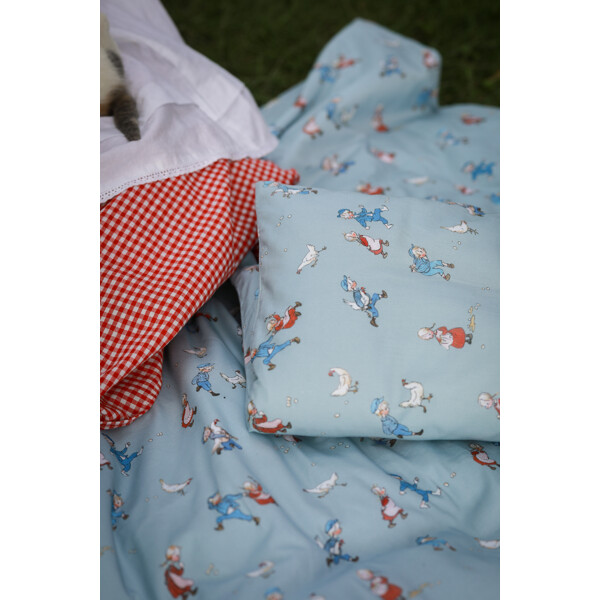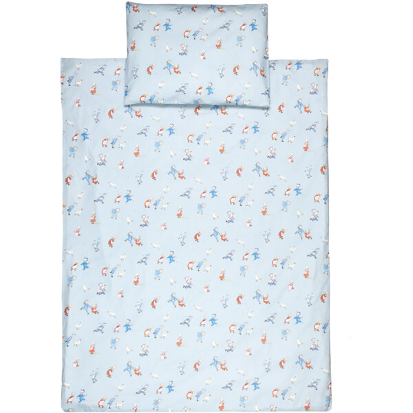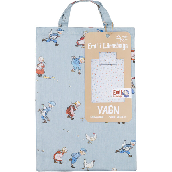 Pussilakana ja tyynyliina, joissa on kuvitus Vaahteramäen Eemelistä. Valmistettu puuvillasta.