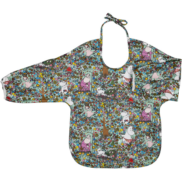 Käytännöllinen hihallinen ruokalappu, jota voi käyttää sekä ruokailussa että leikeissä Muumi-aiheella.
