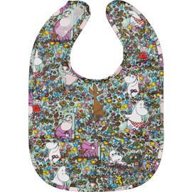 Käytännöllinen ruokalappu Muumi-kuviolla, joka suojaa vaatteita lialta ja roiskeilta.