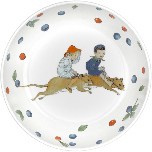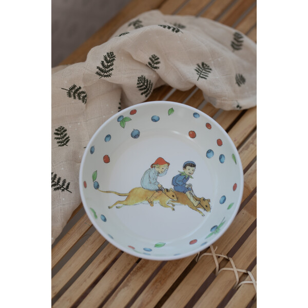 Syvä kulho, jossa on Elsa Beskowin Putte seikkailee mustikkametsässä -aiheinen kuvio, valmistettu RPET:stä, joka on ympäristöystävällinen materiaali.