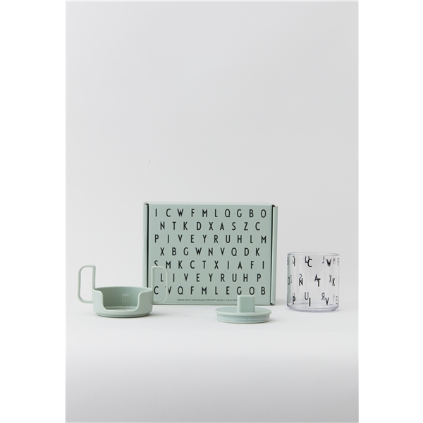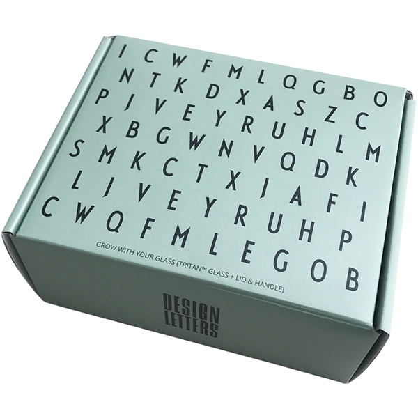 Design Letters Grow With Your Glass ABC Green on pakattuna hienoon lahjapakkaukseen, täydellinen annettavaksi lahjaksi. Paketissa on lasi, kansi ja kahva, ja se kasvaa lapsen mukana vauvasta kouluikään. Lasissa on hienot kirjaimet A-Z ja se haastaa lasta opettelemaan kirjaimia.