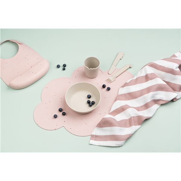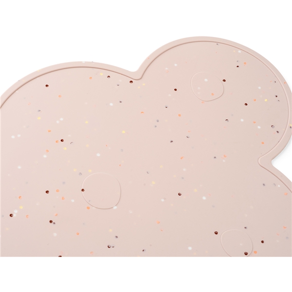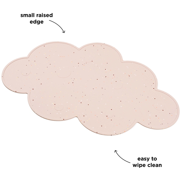 Söpö pilvenmuotoinen tabletti pehmeissä väreissä. Hauskoilla konfeteilla höystettynä se on valmis niin arkikäyttöön kuin juhliin. Alustassa on pieni korotettu reuna, joka pysäyttää läikkyneet nesteet.