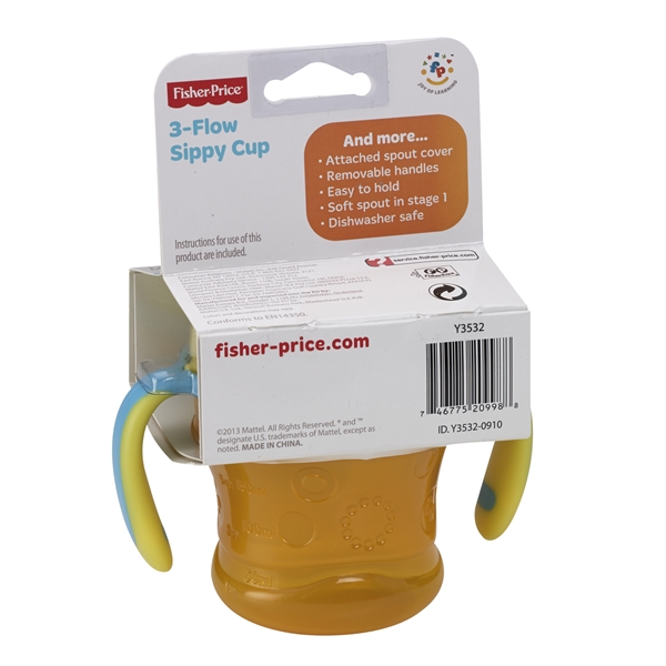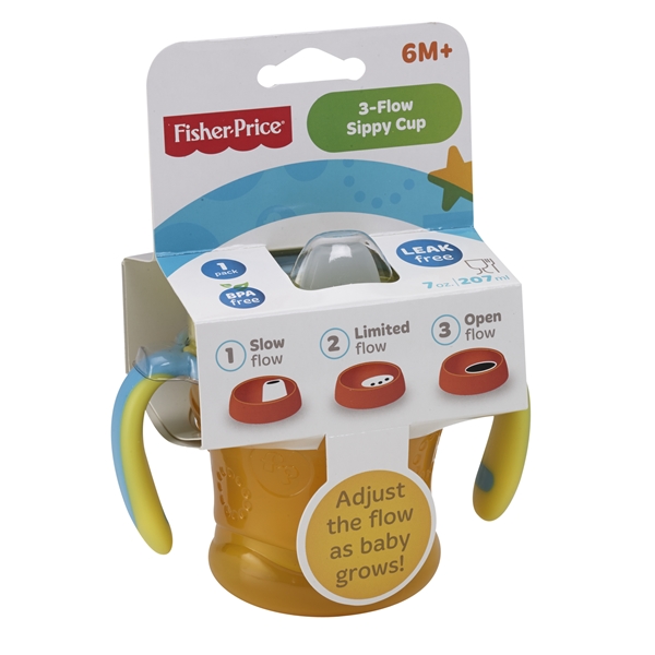 Fisher Price Gear - 3 in 1 -nokkamuki on muki, joka ei vuoda. Kannen keskellä on käännettävä silikoninokka, jonka ansiosta lapsen on helppo siirtyä käyttämään nokkamukia tuttipullon sijaan. Mukissa on kolmiasteinen imuvoiman säätömahdollisuus, jota voi säätää lapsen oman tahdin mukaan. Aste 1 hidas virtaus. Aste rajoitettu virtaus. Aste 3 täysi virtaus. Nokkamukin tilavuus on 236 ml.Konepestävä.Nokkamuki ei sisällä BPA:ta.