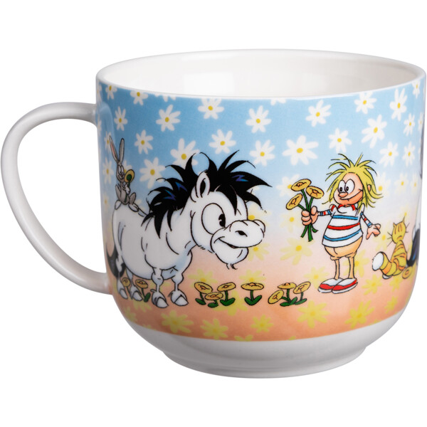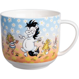 Suuri, pehmeästi pyöristetty teemuki valkoista keramiikkaa, jossa on iloinen Hästen Mulle -aihe Lena Furbergilta.