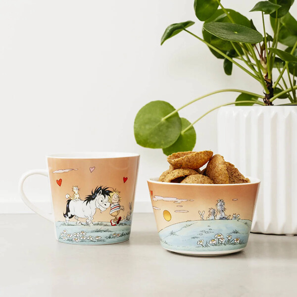 Posliinikulho, jonka ulkopuolella on Lena Furbergin viehättävä kuvaus Hevonen Mullesta.