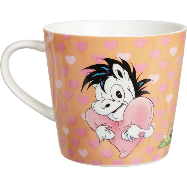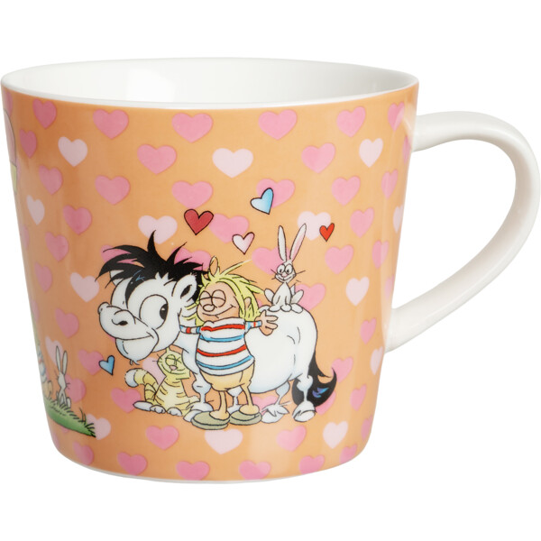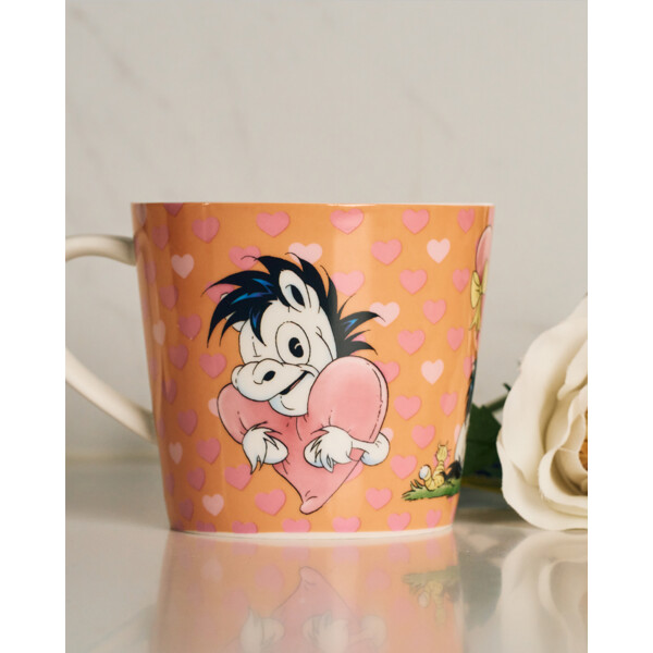 Valkoinen posliinimuki, joka on reilun kokoinen ja vetää 3,5 dl. Muki on kauttaaltaan kuvioitu Lena Furbergin suloisella Hevonen Mulle -aiheella, jossa Mulle viettää aikaa parhaiden ystäviensä kanssa. Taustalla on pieniä sydämiä eri vaaleanpunaisen sävyissä.
