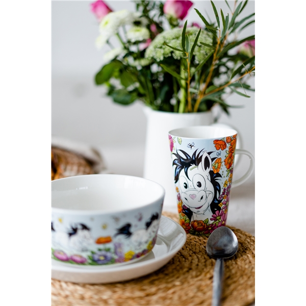 Mulle Hevonen Lattemuki Kesäniitty on kaunis lattemuki aiheenaan Mulle-hevonen, jokka hyppelehtii ympäriinsä kauniilla ja värikkäällä kesäniityllä. Mukin on kuvittanut Lena Furberg.