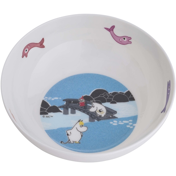 Kirjailija ja taiteilija Tove Jansson rakasti luontoa ja sen erityistä valoa. Lähestulkoon kaikki hänen kertomuksensa ja kuvituksensa kuvaavat luontoa. Sarjassa "Metsä ja Järvi" ovat kuvitukset otettu fantastisesta kuvamateriaalista, jossa vesi ja taivas, aivan kuin pohjoismaiset kesät salamoivat rätisevän kultaisina tai palavat kuin tuli. Uskomattoman taiteellisessa sarjassa useat Muumilaakson asukkaat kuvataan juuri näiden kauniiden taivaiden alla.Kulho on valmistettu naarmuuntumattomasta melamiinimuovista ja siinä on imukuppirengas, ilman PVC'tä. Kulhossa on hieno kuva Muumista, Niiskuneidistä ja Pikku Myystä. Tuote toimitetaan mahdollisimman vähässä pakkauksessa, suojaten tuotetta, mutta vähentäen pakkausmateriaalin määrää.