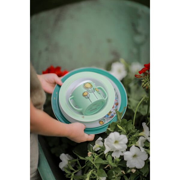 Sisältää nokkamukin, jossa on kaksi kahvaa ja kansi pysyy tiukasti paikoillaan silikonirenkaan avulla. Nokassa on roiskesuoja, joka rajoittaa virtausta. Kun lapsi kasvaa, venttiilin voi poistaa. Setissä on myös syvä ja matala lautanen, joiden alla on silikonirengas, joka tekee niistä tukevia pöydällä.