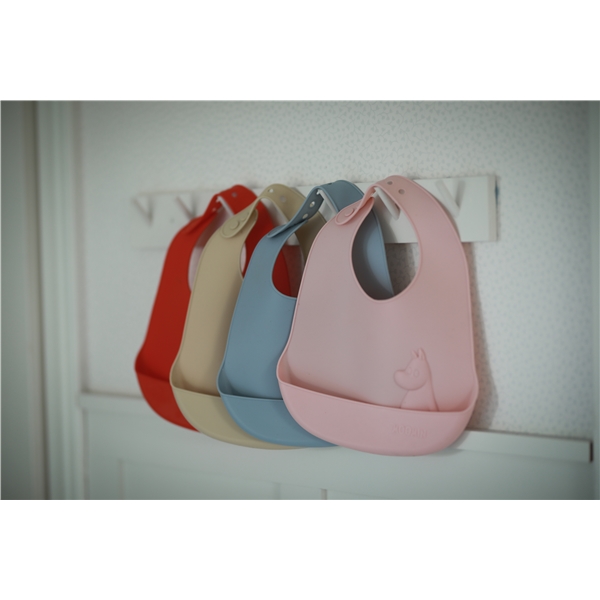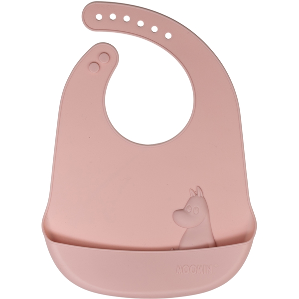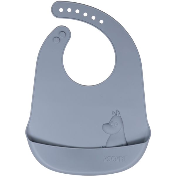Ihana silikoninen ruokalappu Muumi-kuviolla, joka on pehmeä ja mukava lapsen käyttää ja voidaan rullata kokoon kätevää säilytystä varten hoitolaukussa. Tasku kerää ruoan ennen kuin se päätyy lattialle tai syliin.