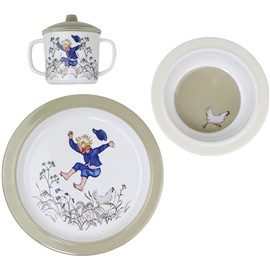 Kaunis lastenastiasto kolmessa osassa. Sisältää nokkamukin, jossa on kaksi kahvaa ja kansi pysyy tiukasti paikoillaan silikonirenkaan avulla. Nokassa on roiskeenestoventtiili, joka rajoittaa virtausta. Kun lapsi kasvaa, venttiilin voi poistaa. Setissä on myös syvä ja matala lautanen, joiden alla on silikonirengas, joka tekee niistä tukevia pöydällä.