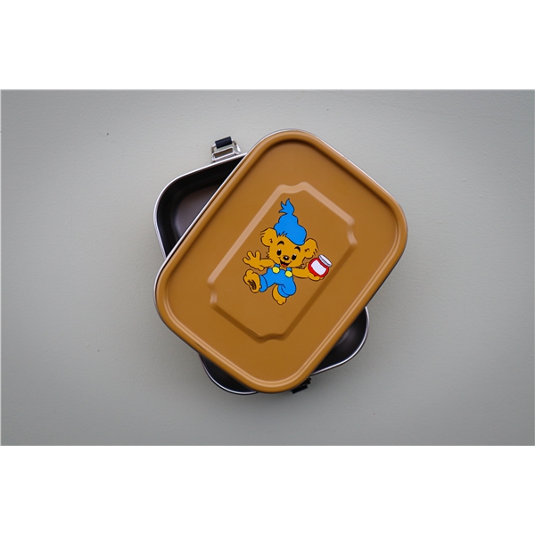 Bamse Eväslaatikko Teräs on värikäs Bamse-aiheinen eväslaatikko ruostumattomasta teräksestä. kansi avataan ja suljetaan helposti sivulukoin. Juuri sopiva piknikille tai retkelle otettavaksi, mutta sitä voi tietysti myös käyttää vaikkapa liitujen tai muiden pikkuesineiden säilytykseen lastenhuoneessa.
