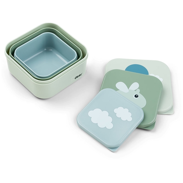 Done By Deer Snack Box Happy Clouds ovat kolme eri kokoista rasiaa, jotka ovat täydelliset liikkeellä ollessasi. Niihin on helppo pakata välipalaa lapsille seikkailuihin lähtiessä. Eväsrasioihin on helppo erotella ruokaa, mutta niitä voi myös käyttää liitujen ja muiden pikkuesineiden lajittelemiseen reissulla.