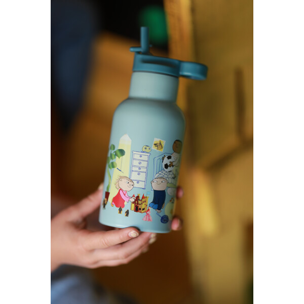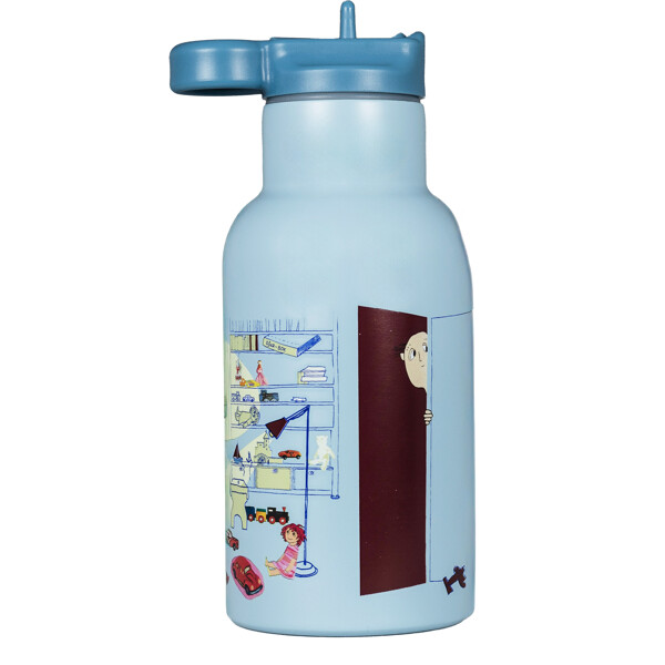 Korkealaatuisesta teräksestä valmistettu pullo, jossa on Alfons Åberg -aiheinen kuvio.Pullossa on termotoiminto, joka pitää nesteet sekä lämpiminä että kylminä hetken aikaa. Pullon sisällä on irrotettava muovinen pilli, joka annostelee sopivan määrän juodessa. Pullo on helppo avata ja sulkea. Kahva tekee pullon mukaan ottamisesta helppoa, myös pienille lapsille. Sekä nokka että pilli ovat saatavilla varaosina.Pullon nokka ei ole tarkoitettu pureskeltavaksi tai purtavaksi. Pulloa voi käyttää pienille lapsille, mutta silloin aikuisen on valvottava käyttöä. Sulje aina nokka, kun pulloa ei käytetä, jotta nokka ei rikkoudu.