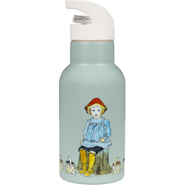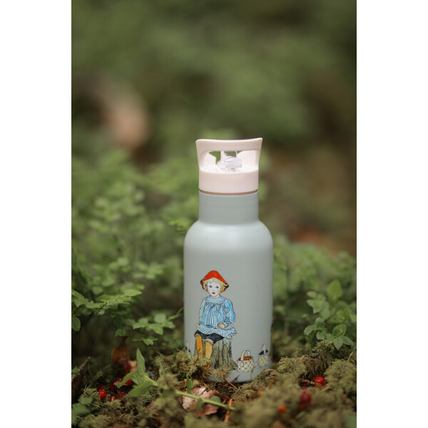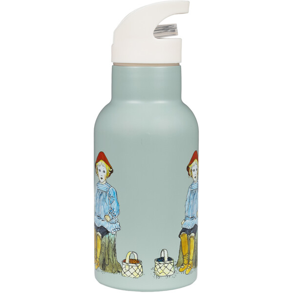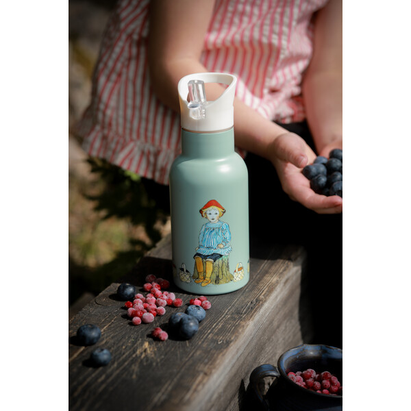 Korkealaatuisesta teräksestä valmistettu pullo, jossa on kuvioita Elsa Beskowin kirjasta Putten seikkailuista Mustikkametsässä.