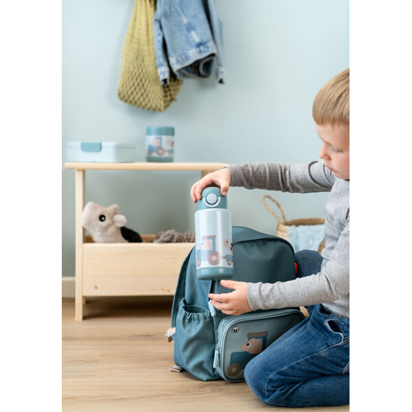 Harkitut yksityiskohdat tekevät siitä helpon pienten käsitellä itse: painonappikansi, joka on suunniteltu pienille sormille, turvallinen silikonitiiviste estämään vuotoja reppuihin ja kätevä kantokahva liikkuvaan elämään. Pullo pitää juomat juuri sellaisina kuin pienokaisesi haluaa – lämpiminä tai kylminä – jopa kuusi tuntia liikkeellä ollessasi. Tilavuudeltaan 340 ml se on täydellinen koko pysyäksesi virkistyneenä, aamupalasta iltapäiväleikkeihin.