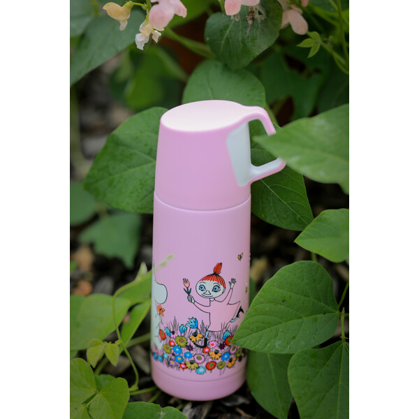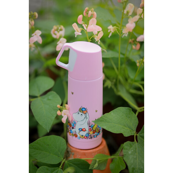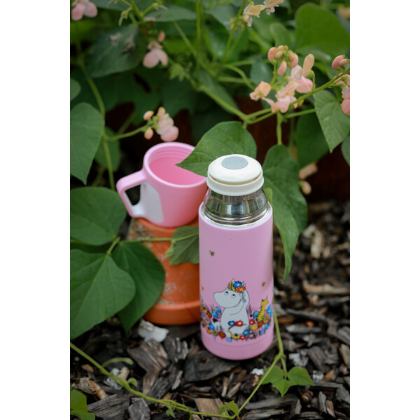 Ihana ruostumattomasta teräksestä valmistettu termos, jossa on Muumi-aihe.