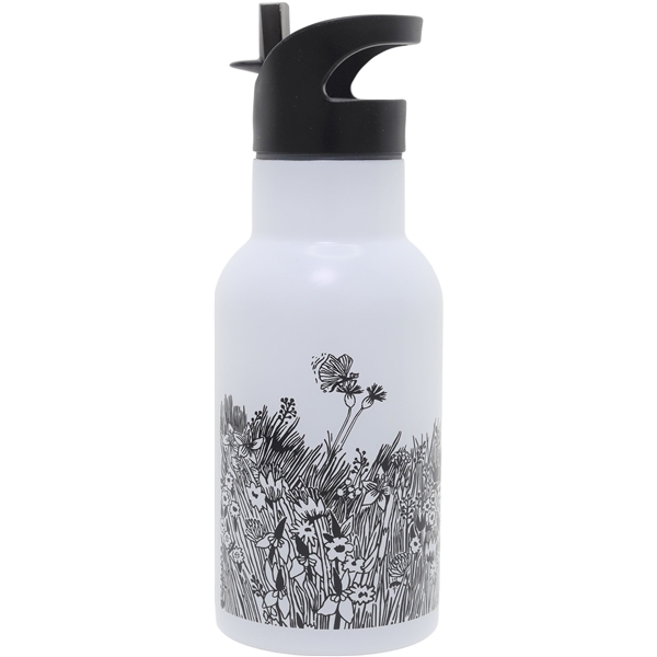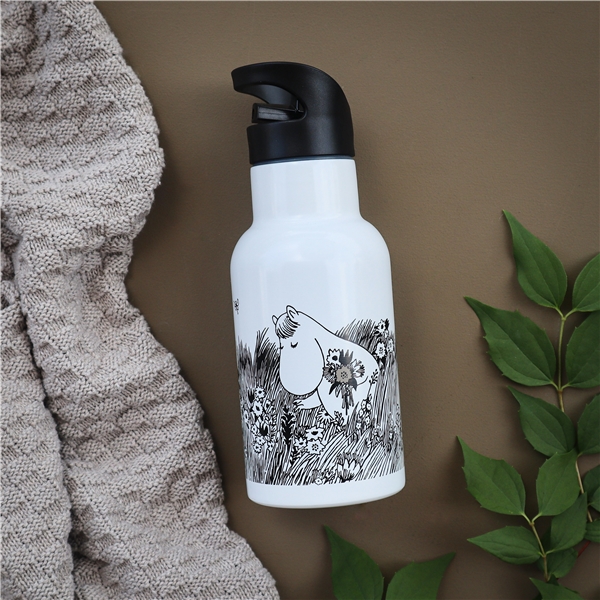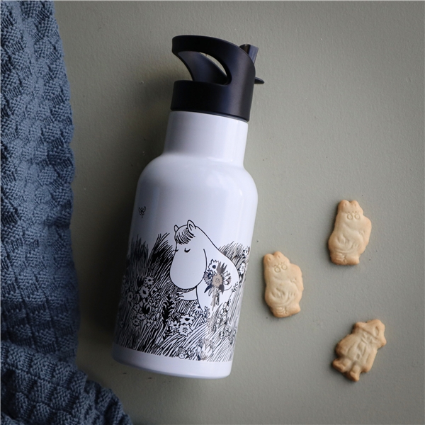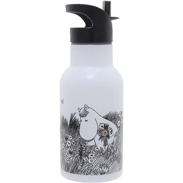 Superhieno pullo korkealatuisesta teräksestä Muumiaiheella. Pullossa on termotoiminto, jonka avulla nesteet pysyvät sekä lämpiminä että kylminä. Sisällä on irrotettava muovinen pilli, joka annostelee sinulle sopivan määrän juodessasi.