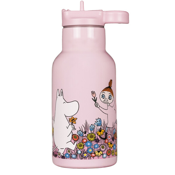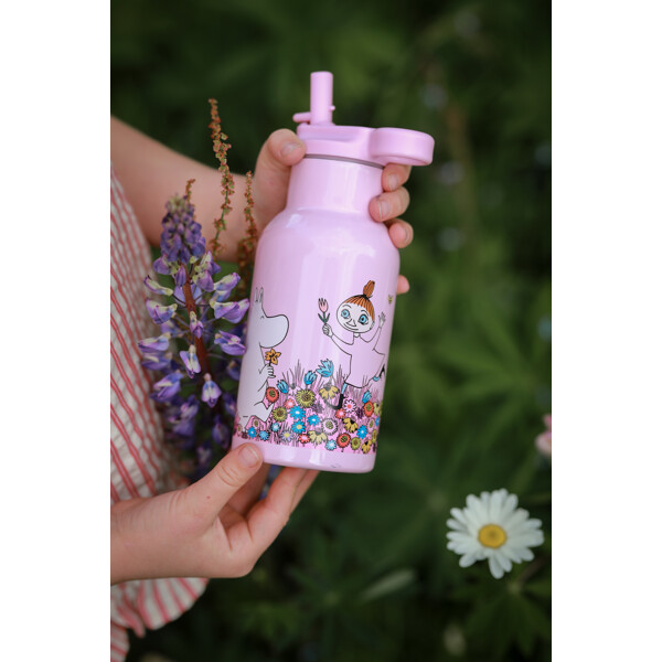 Korkealaatuisesta teräksestä valmistettu pullo, jossa on Muumi-aihe.
