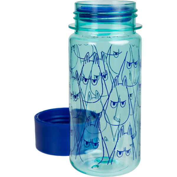 Käytännöllinen 3 dl vesipullo, jossa on hauska mutta äkäinen Muumipeikko-painatus. Sininen pullo on läpinäkyvä ja valmistettu BPA-vapaasta tritaanimuovista. Kierrekorkin alla on irrotettava välikappale, joka helpottaa pienempien kulausten juomista myös nuoremmille lapsille.