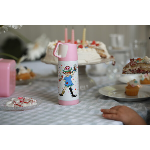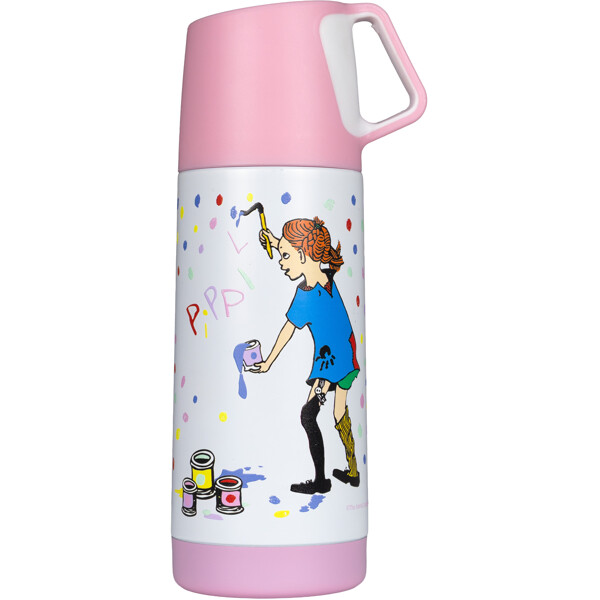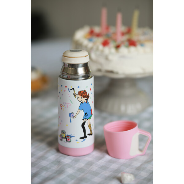 Ihana ruostumattomasta teräksestä valmistettu termospullo, jossa on Peppi Pitkätossu -aihe.