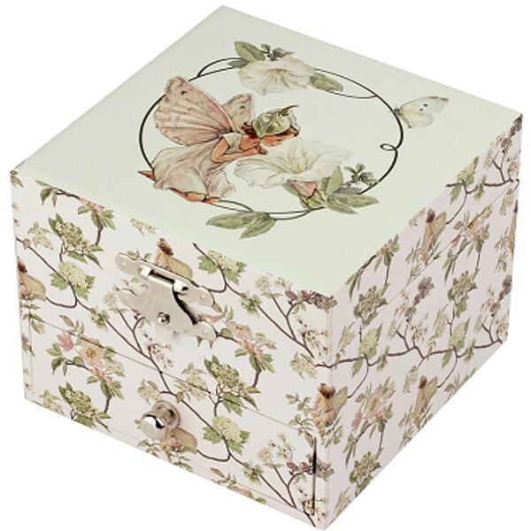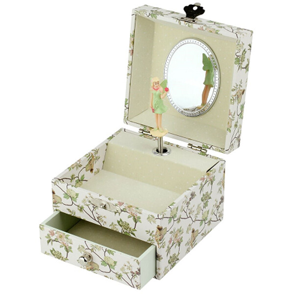 Satumaisen kaunis korurasia, jossa tanssiva keiju. Rasiassa on myös laatikko.
