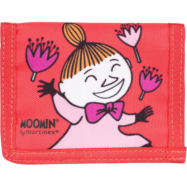 Värikäs Muumi-lompakko tukevasta polyesterikankaasta, iloisella Pikku Myyllä ja kukilla. Vetoketjullinen sisätasku kolikoille ja lokero henkilökortille ja seteleille. Suljetaan tarranauhalla.